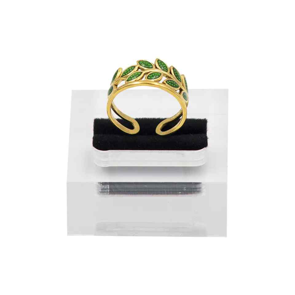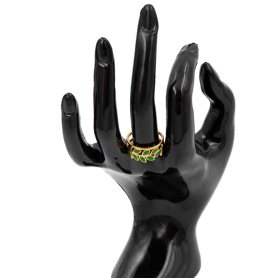 Embrace the free spirit with this ring. Vibrant green leaves, dancing playfully around a gold-colored band, evoke the carefree spirit of summer. Let your soul sing, wear the rhythm of your own wild melody.