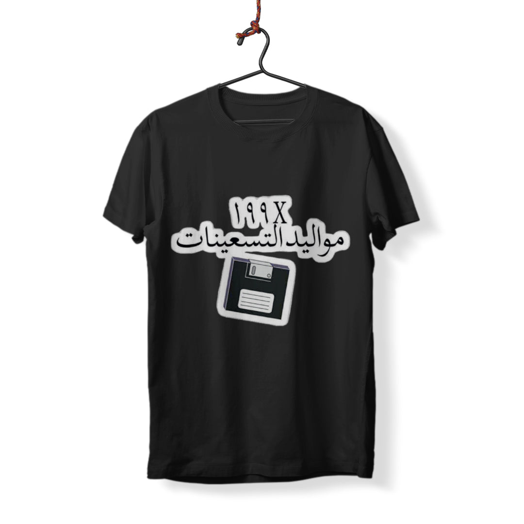 A nostalgic white tee celebrating the 90s generation, featuring Arabic text and a retro floppy disk graphic, perfect for old-school vibes