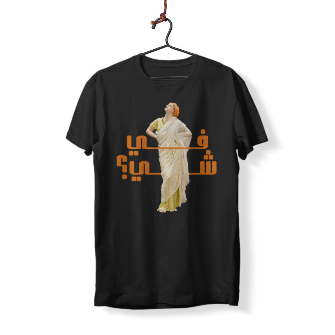 Spark curiosity with our enigmatic t-shirt design. This Arabic phrase, meaning ‘Is there something?’, invites contemplation and ignites conversation, making it a unique addition to your wardrobe.