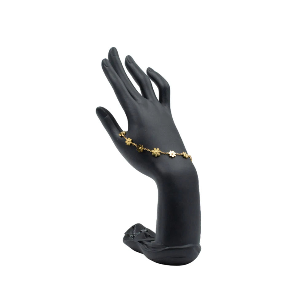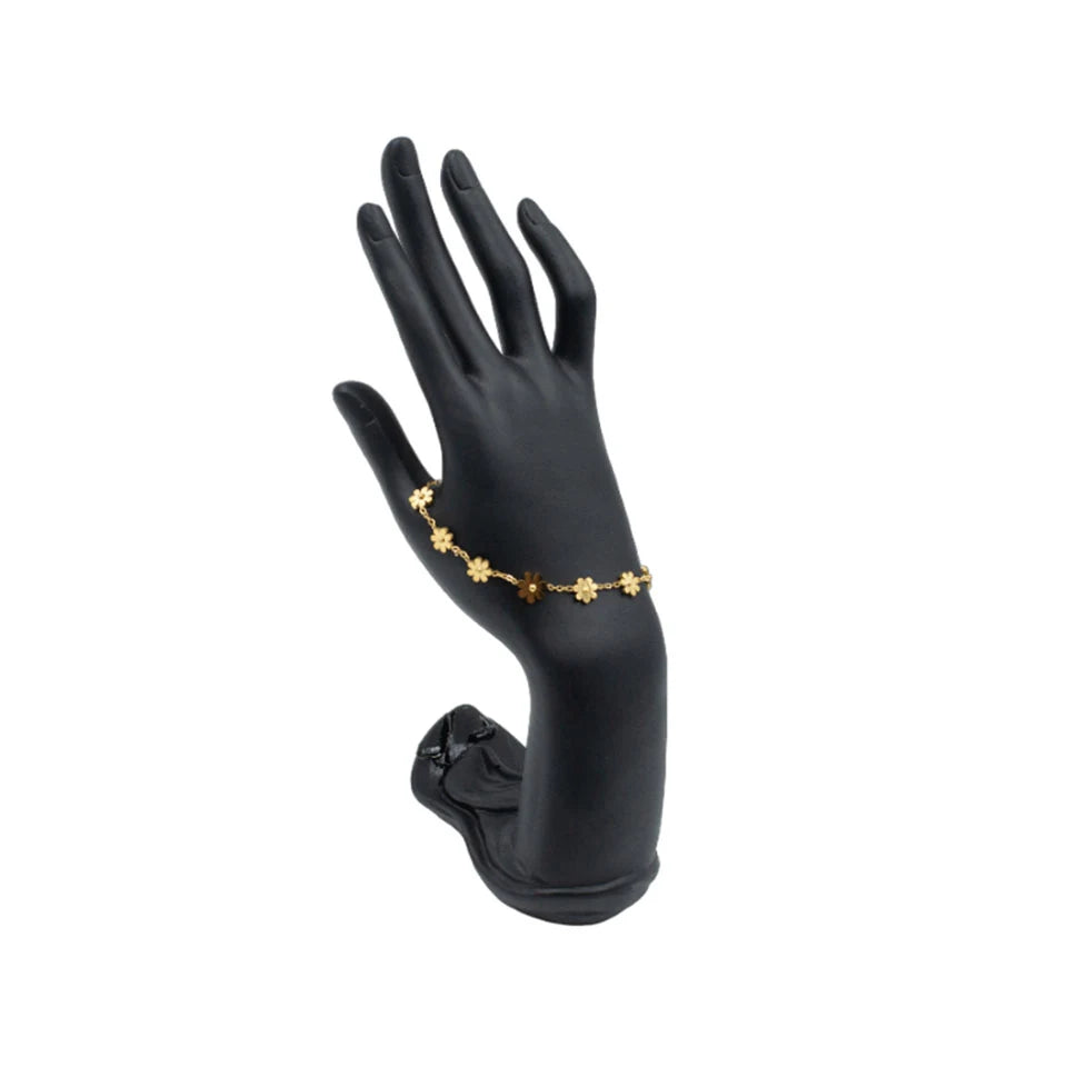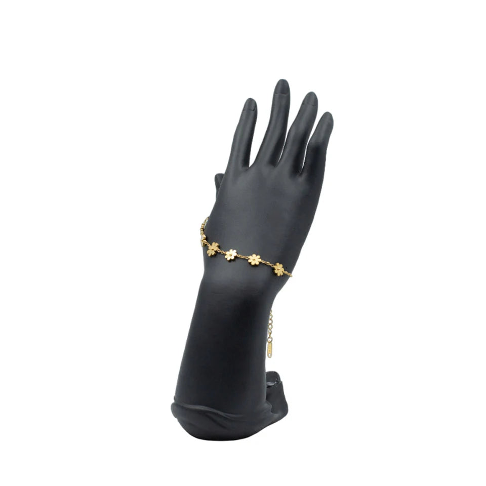 Embrace the charm of nature with our Golden Floral Bracelet, a piece that radiates refinement and sophistication. Each petal is finely sculpted and polished, forming a bracelet that captures the essence of blooming flowers in a golden glow.