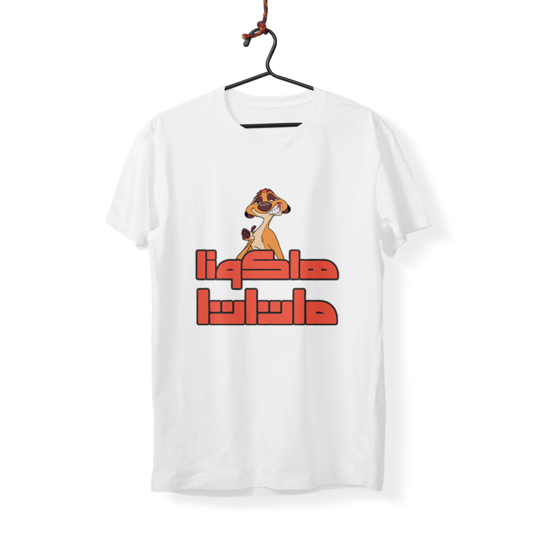 Carefree vibes and childhood nostalgia in one look, this design brings back the iconic hakuna matata spirit with a fun Arabic twist.